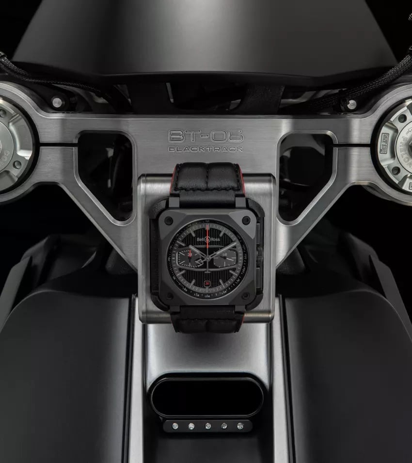 Las exclusivas subesferas toman la característica forma de las esferas del manillar de las motocicletas, incluyendo los detalles más meticulosos, como la superposición del segundero del cronógrafo, que forma la “B” de Blacktrack. El tratamiento con Super-LumiNova difiere del estilo estándar de Bell & Ross, aplicado con matices en los índices y las agujas. El reloj, gracias a su lenguaje de diseño, se puede integrar en la consola de la motocicleta BT-06.