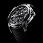 La caja de platino de 47,40 mm de diámetro está montada sobre un brazalete integrado en piel de aligátor negra. Esta pieza se produce en edición limitada de 50 unidades.