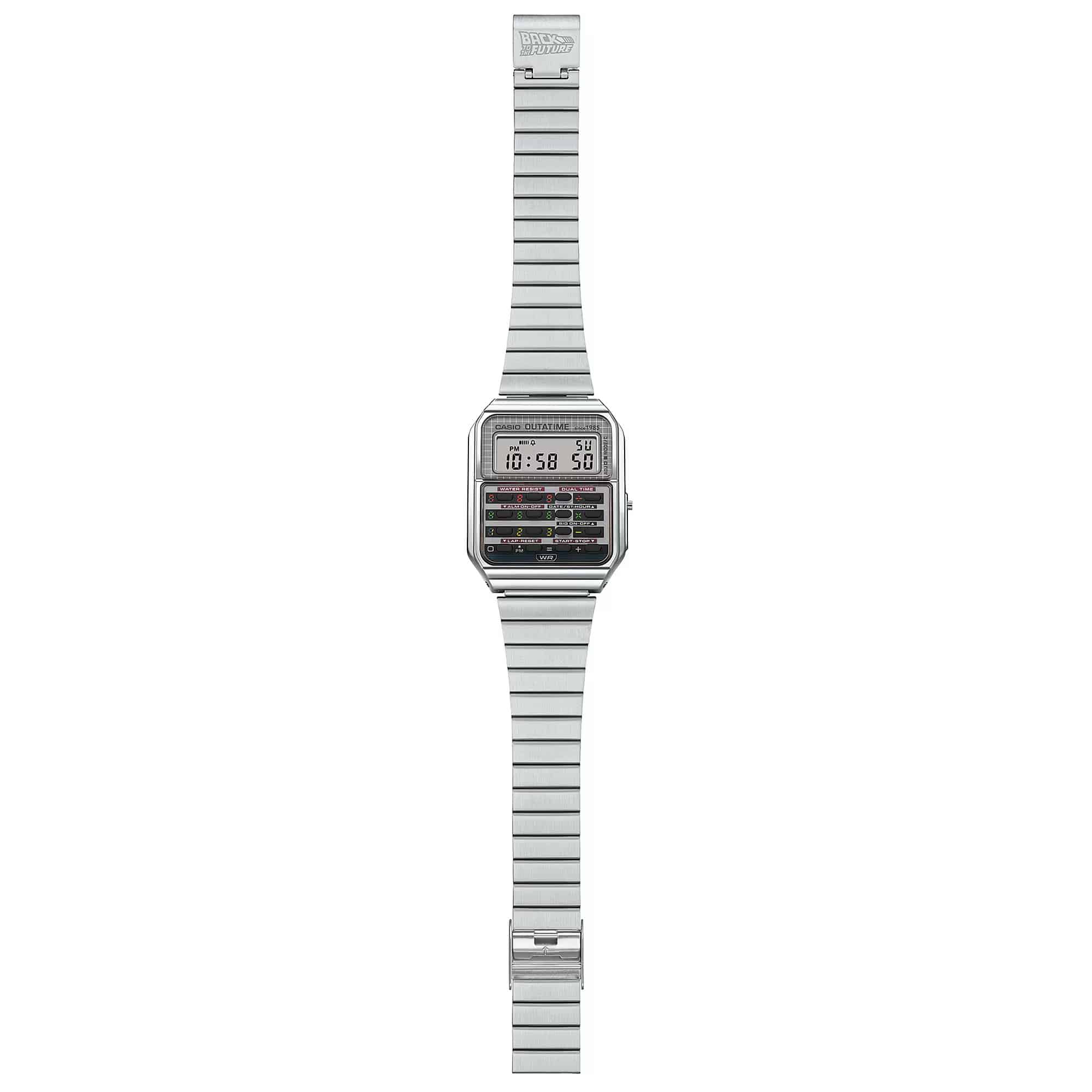 A primera vista, el reloj desprende ese brillo metálico tan característico de la gama Vintage Edgy de Casio. La caja y la pulsera de acero inoxidable tienen un acabado pulido que recuerda al cuerpo de acero cepillado del mítico DeLorean DMC-12, la máquina del tiempo creada por Doc Brown. La elección no es casual: cada reflejo del metal parece evocar las curvas del coche que viajó a 88 millas por hora para romper la barrera temporal.