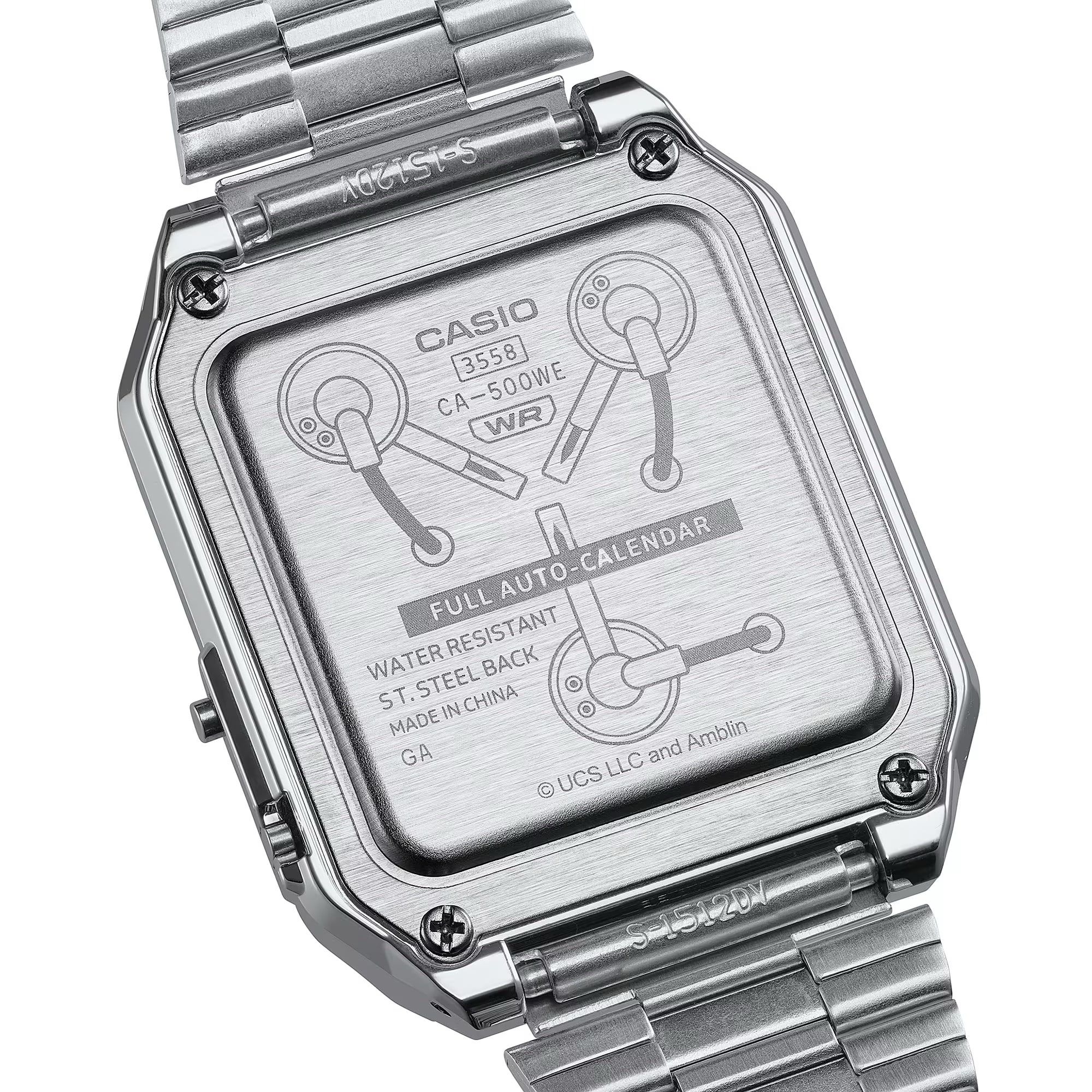 Casi cuatro décadas después, Casio ha decidido rendir tributo al mito cinematográfico y al propio linaje de relojes digitales lanzando el CA-500WEBF, una reinterpretación del CA-500WE, el modelo base metálico de su serie Vintage. Mantiene el ADN clásico del CA-500: forma rectangular, pantalla digital con calculadora de 8 teclas, cronómetro, alarma diaria, calendario automático y precisión de ±15 segundos al mes. Pero lo reviste con una pátina de homenaje cinematográfico que roza lo emocional.