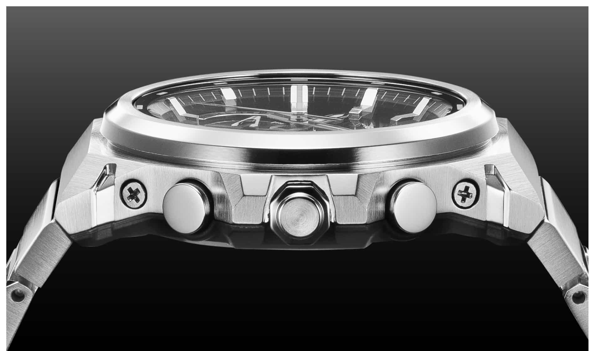 En la parte lateral de la caja se aprecia muy bien la transición entre superficies, demostrando que G-Shock ha puesto especial atención en hacer que este modelo no solo sea resistente, sino también atractivo para quien busca un reloj metálico cuidado y actual.