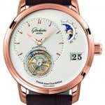El PanoLunar Tourbillon de Glashütte Original está equipado con una correa negra semimate de piel de aligátor de Luisiana o con una correa marrón de piel de nobuk de aligátor de Luisiana y un cierre desplegable en oro rojo.