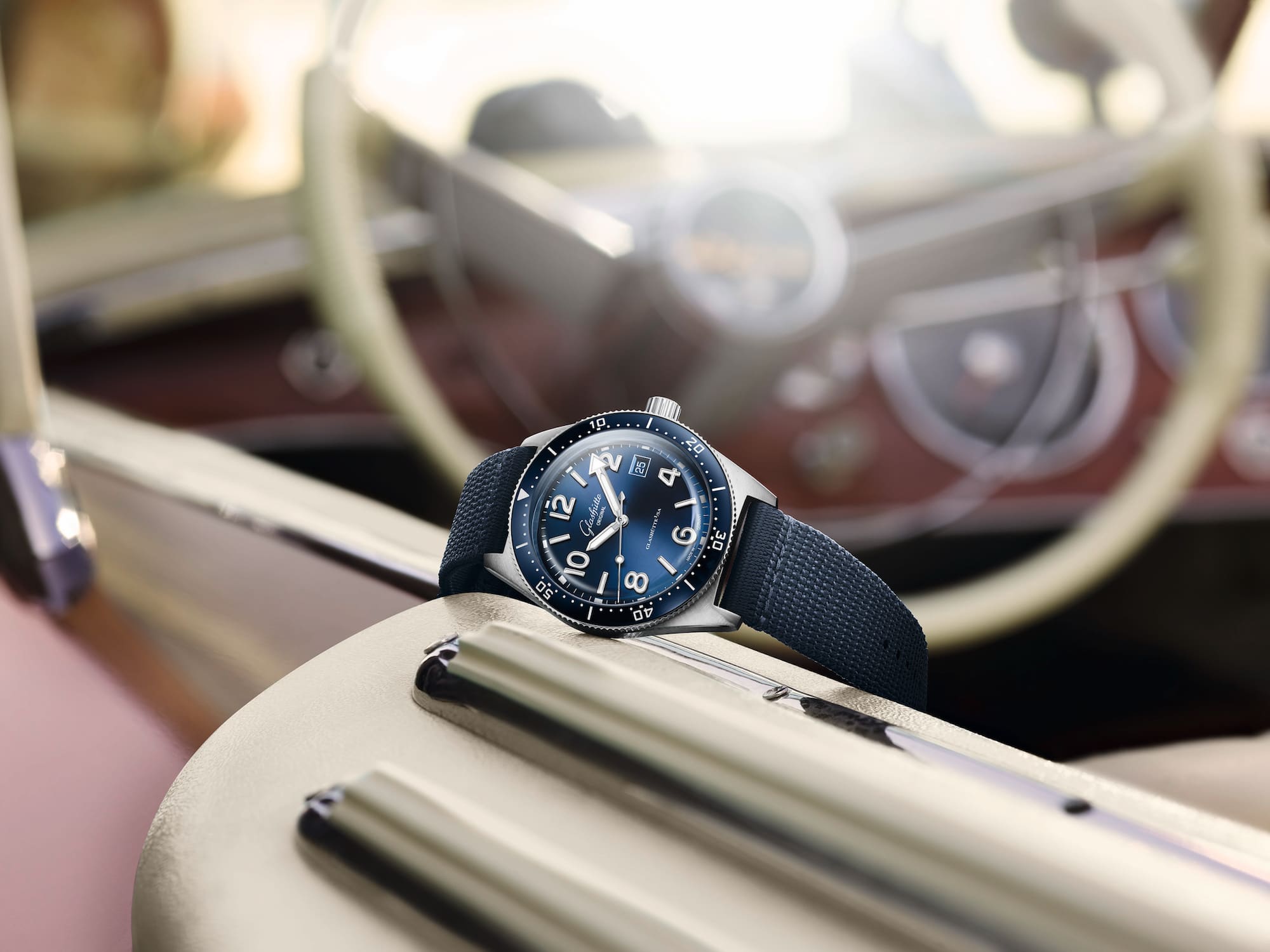 El primer modelo está equipado con una esfera de color azul galvanizado con un delicado acabado SunRay. El bisel giratorio en sentido contrario al de las agujas (levógiro) está equipado con una incrustación cerámica de color azul intenso resistente a los arañazos que adopta el tono azul de la esfera.