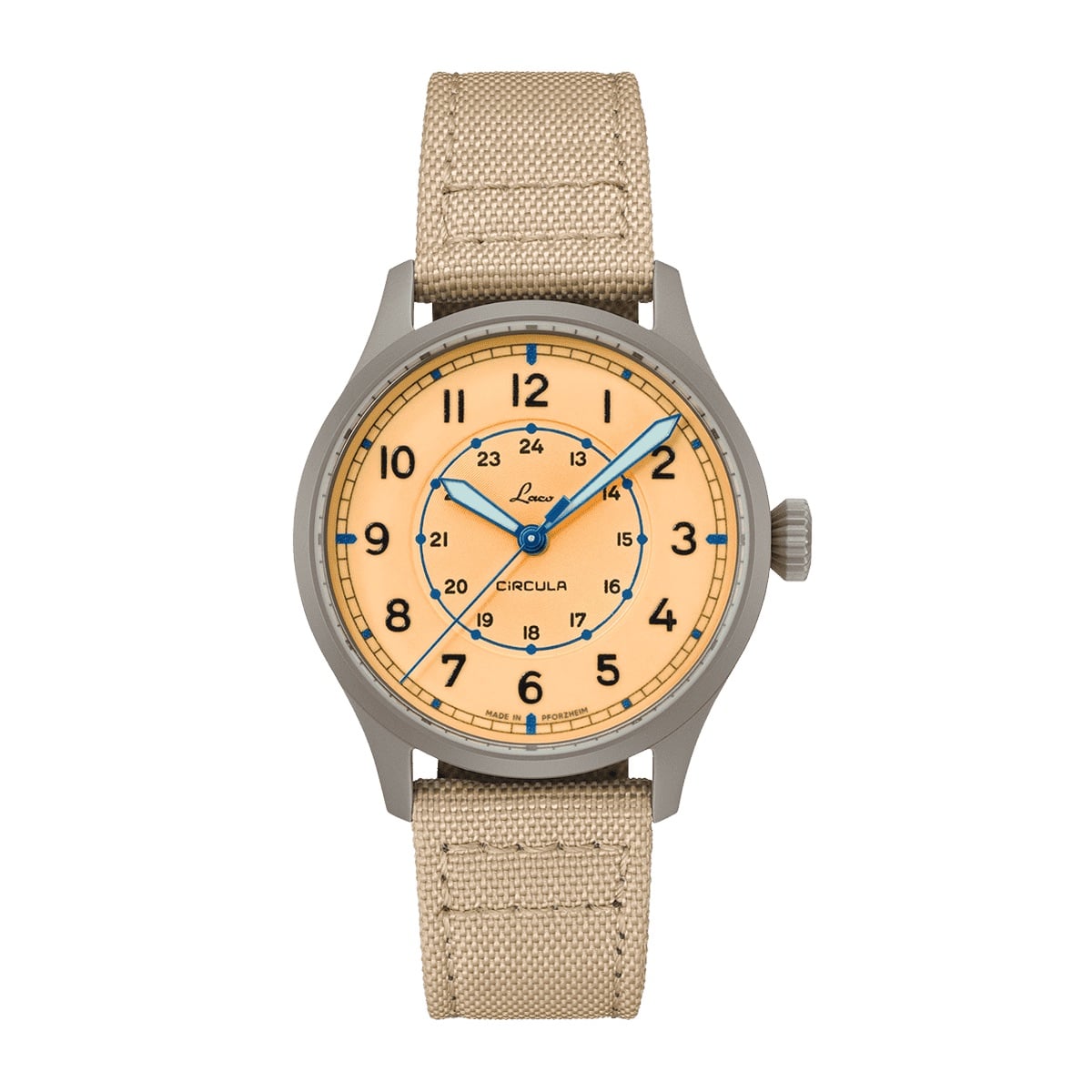 La esfera en tono arena es, sin duda, el elemento más característico. Presenta un graneado circular en la zona interior que aporta textura y profundidad, mientras que el anillo exterior adopta un acabado mate más funcional. La lectura es inmediata gracias a los numerales arábigos en negro y a la disposición de doble escala, con indicación de 24 horas en el interior.