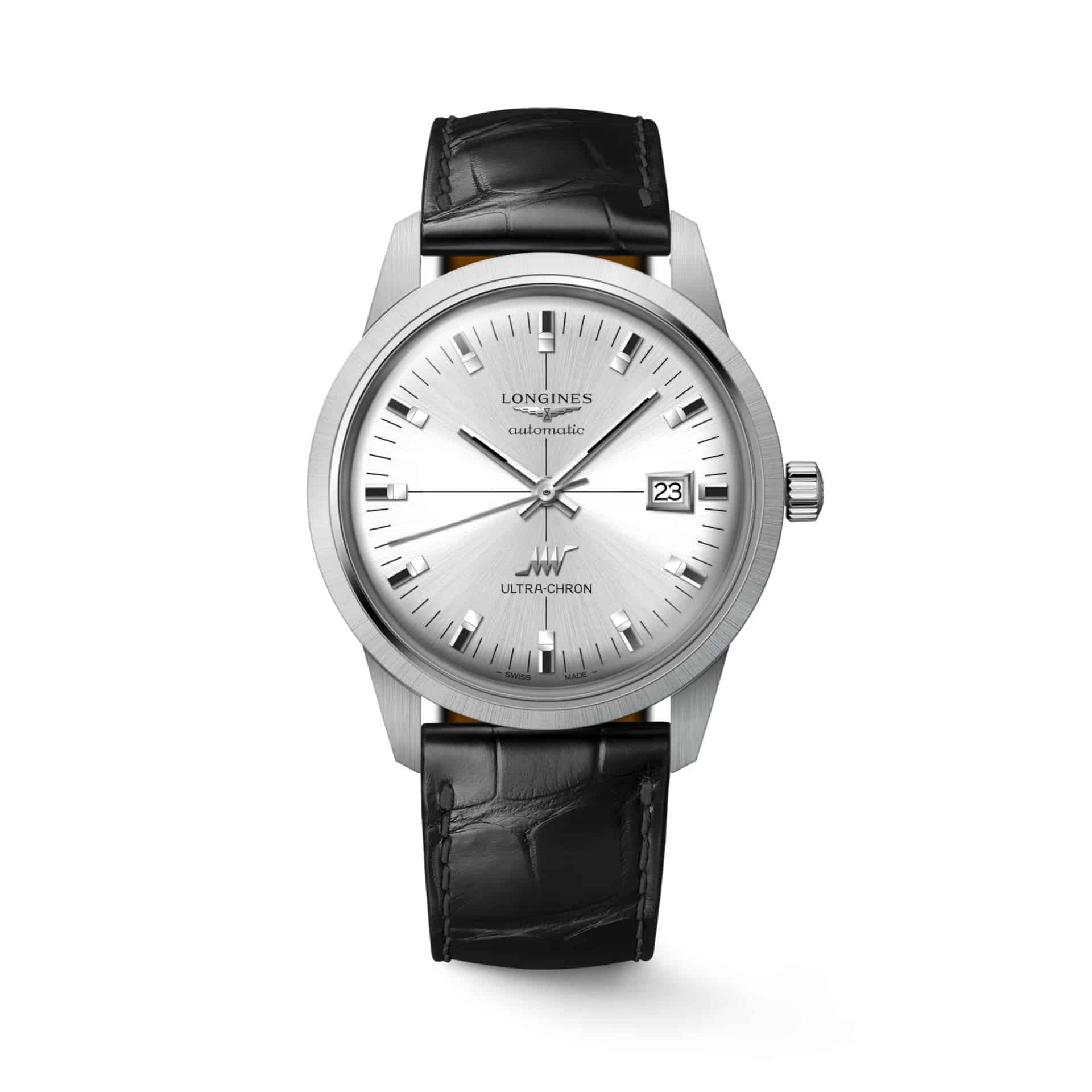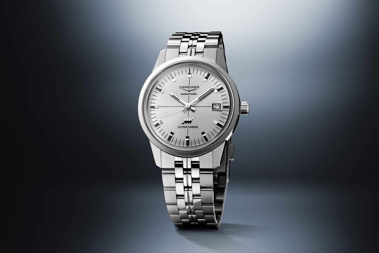 Logotipos aplicados, tanto el reloj de arena alado de Longines como la firma Ultra-Chron, en tipografía histórica.