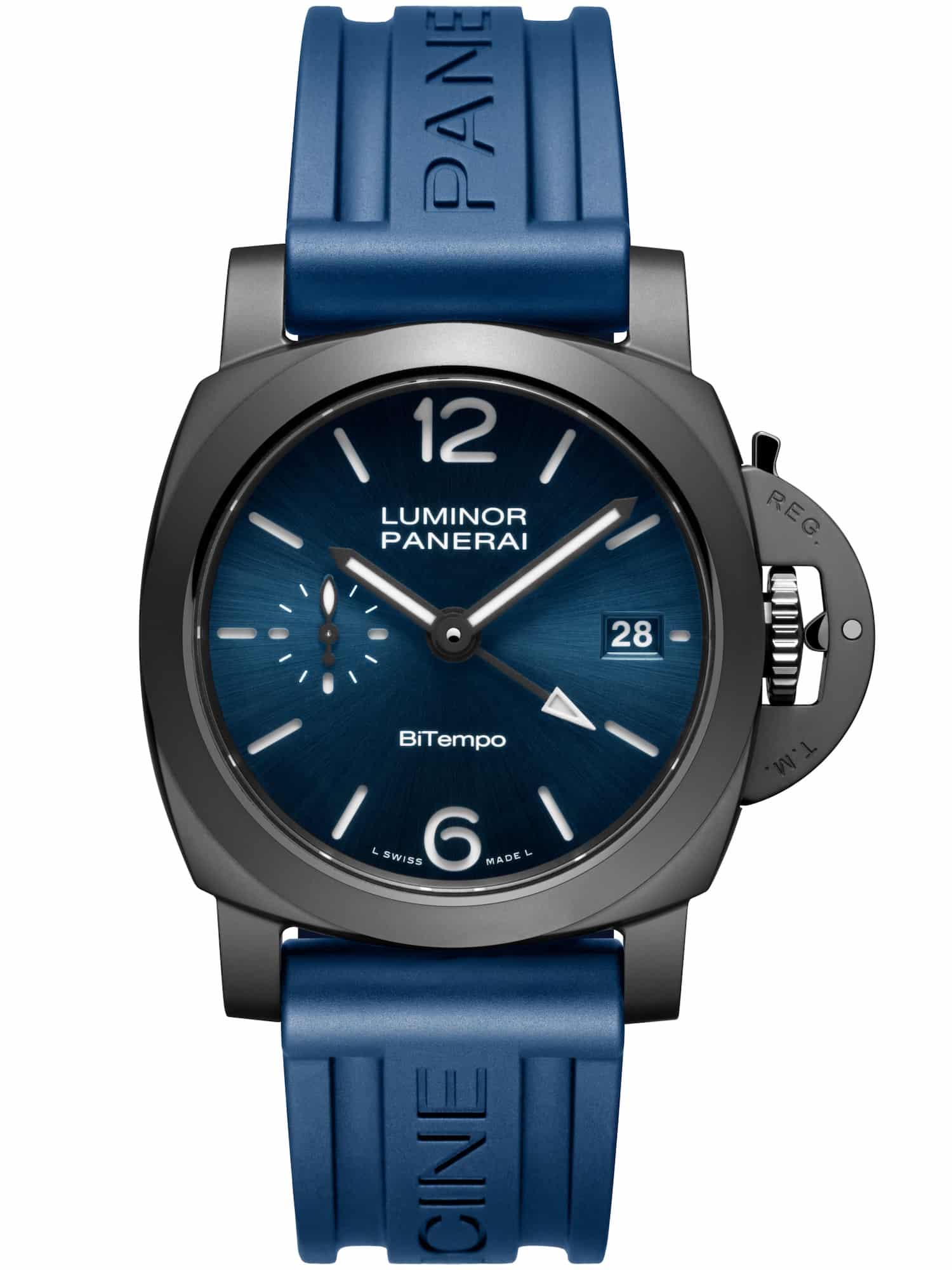 La pieza llega con una correa de piel de becerro negra con pespuntes blancos y hebilla de titanio DLC arenado, una combinación que aporta formalidad y contraste respecto al carácter técnico de la caja. Junto a ella, Panerai incluye una correa adicional de caucho azul, perfecta para el uso deportivo o acuático.