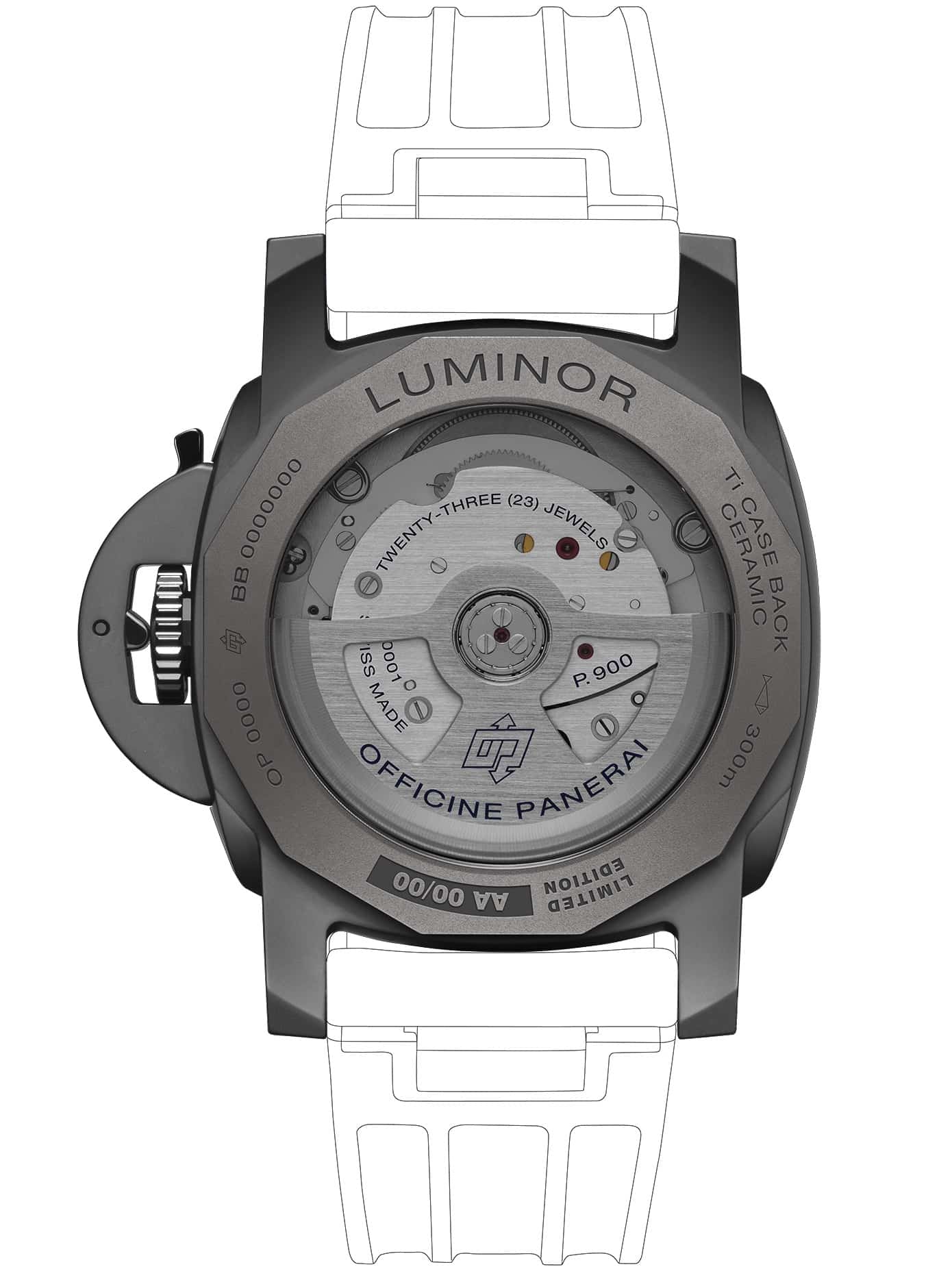El icónico protector de corona adopta también la cerámica como protagonista, ofreciendo la combinación habitual de superficies satinadas y pulidas. El sistema de leva que caracteriza a los Luminor asegura la hermeticidad de 300 metros, una cifra que lo sitúa sin complejos en territorio de reloj-herramienta profesional. Las asas, por su parte, muestran un diseño reforzado para cumplir con los estándares internos de resistencia a impactos, algo especialmente importante en un reloj fabricado en cerámica, material muy duro pero que exige una ingeniería precisa.