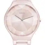 El primer reloj es el heraldo de la primavera. Con su caja de cerámica de alta tecnología de color rosa pulida, evoca el regreso de las flores, con un magnífico cristal de zafiro facetado con flores. Prolonga el tema con un sutil degradado de plateado a rosa claro en la esfera, un borde de color rosa y el logotipo de Rado impreso en gris oscuro.