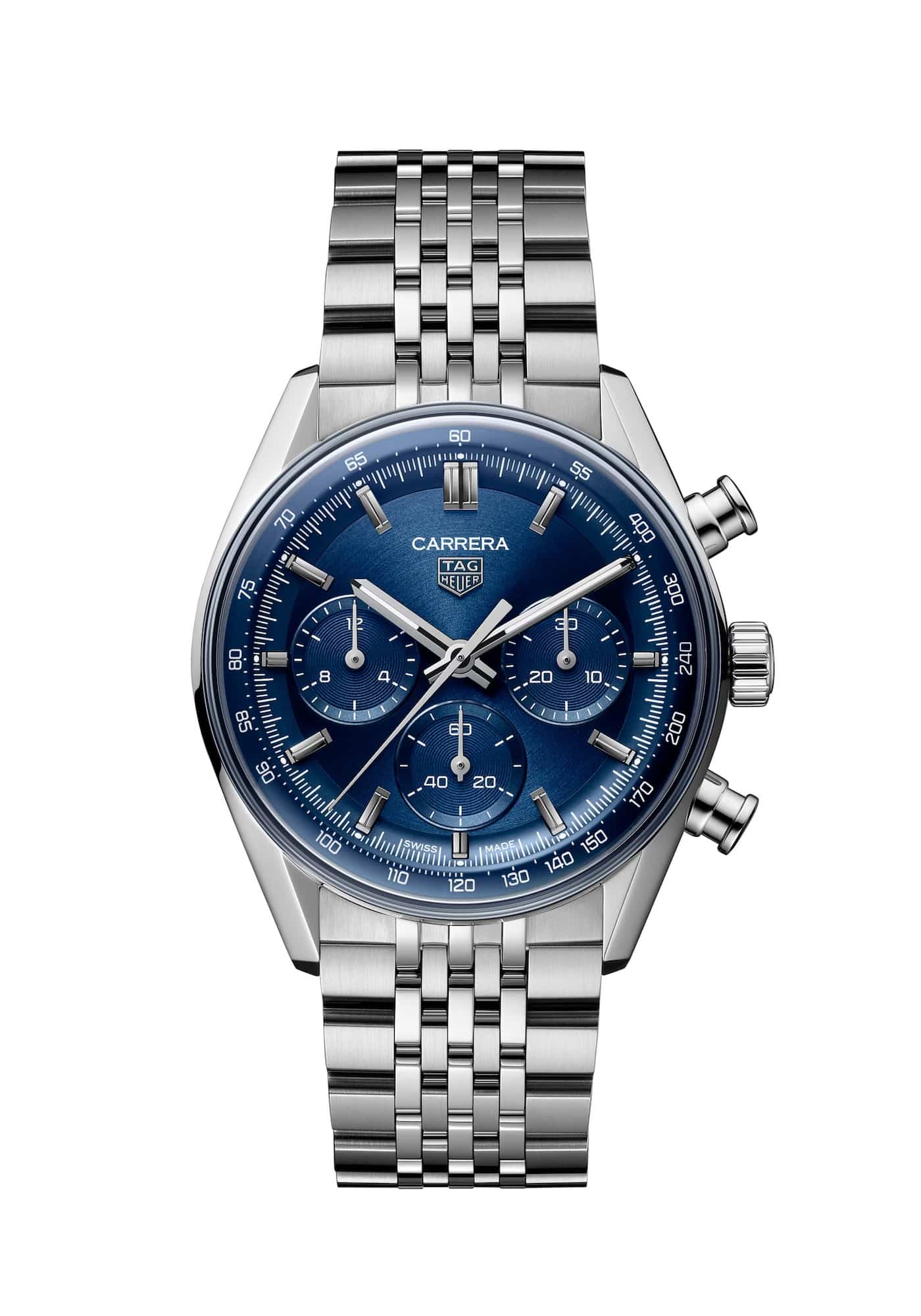 Los índices aplicados y las agujas centrales rodiadas, recubiertos con Super-LumiNova blanca, garantizan una legibilidad excelente. El logotipo HEUER plateado se integra de forma discreta, sin romper el equilibrio general. Además, el realce curvado incorpora tanto la escala de minutos como el taquímetro, aportando profundidad sin sobrecargar el diseño.