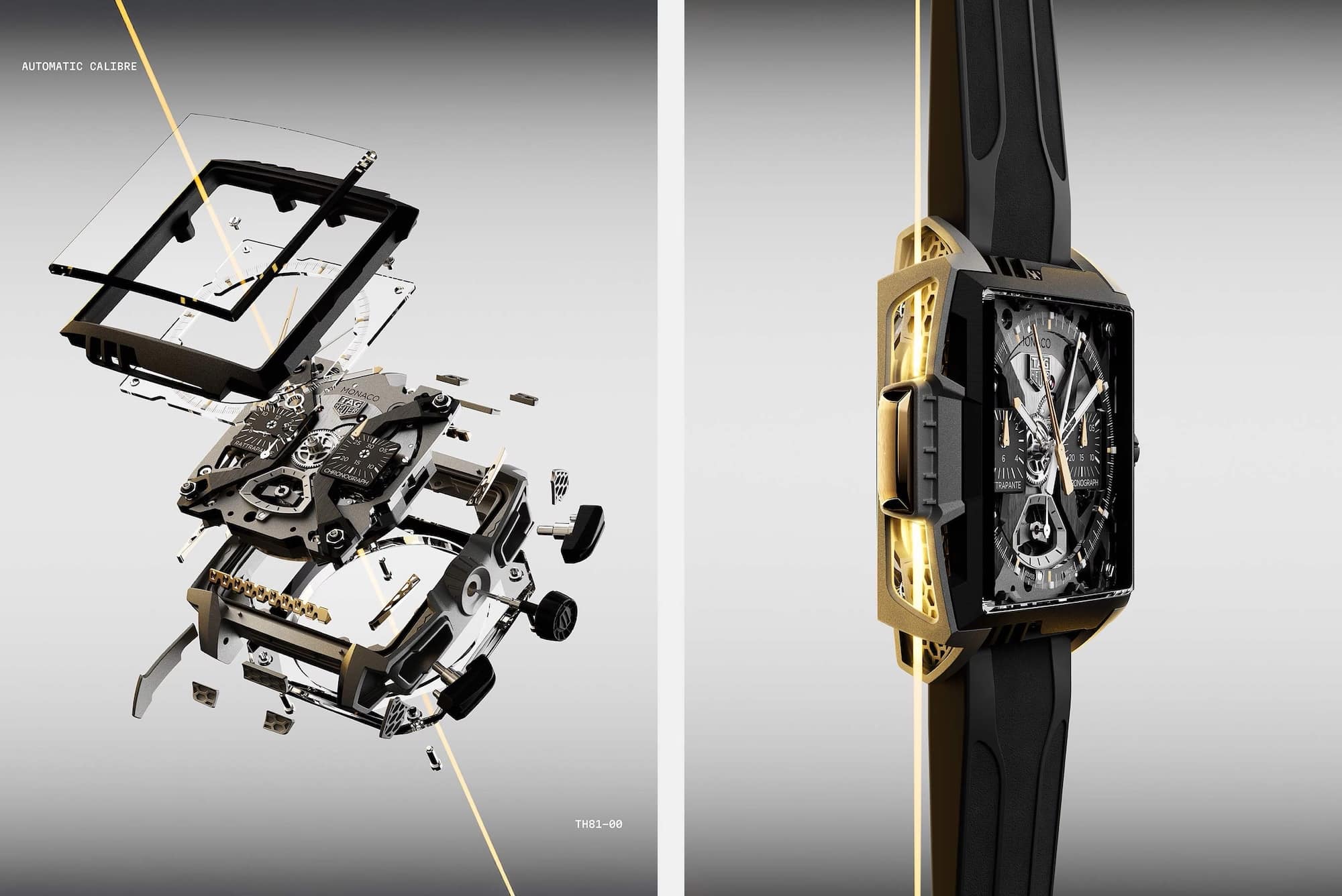 El resultado es una arquitectura tridimensional visible, donde cada hueco y cada arista tiene un propósito tanto técnico como estético. Las rejillas laterales de titanio arenado aportan textura y carácter, mientras que bajo el bisel aparece uno de los detalles más lujosos: rejillas en oro amarillo 18 quilates 2N cortadas a láser, perfectamente integradas en la estructura. Esta mezcla de materiales —titanio técnico y oro cálido— está ejecutada con una precisión que sorprende incluso acostumbrados a lo que TAG Heuer suele ofrecer en sus piezas más experimentales.