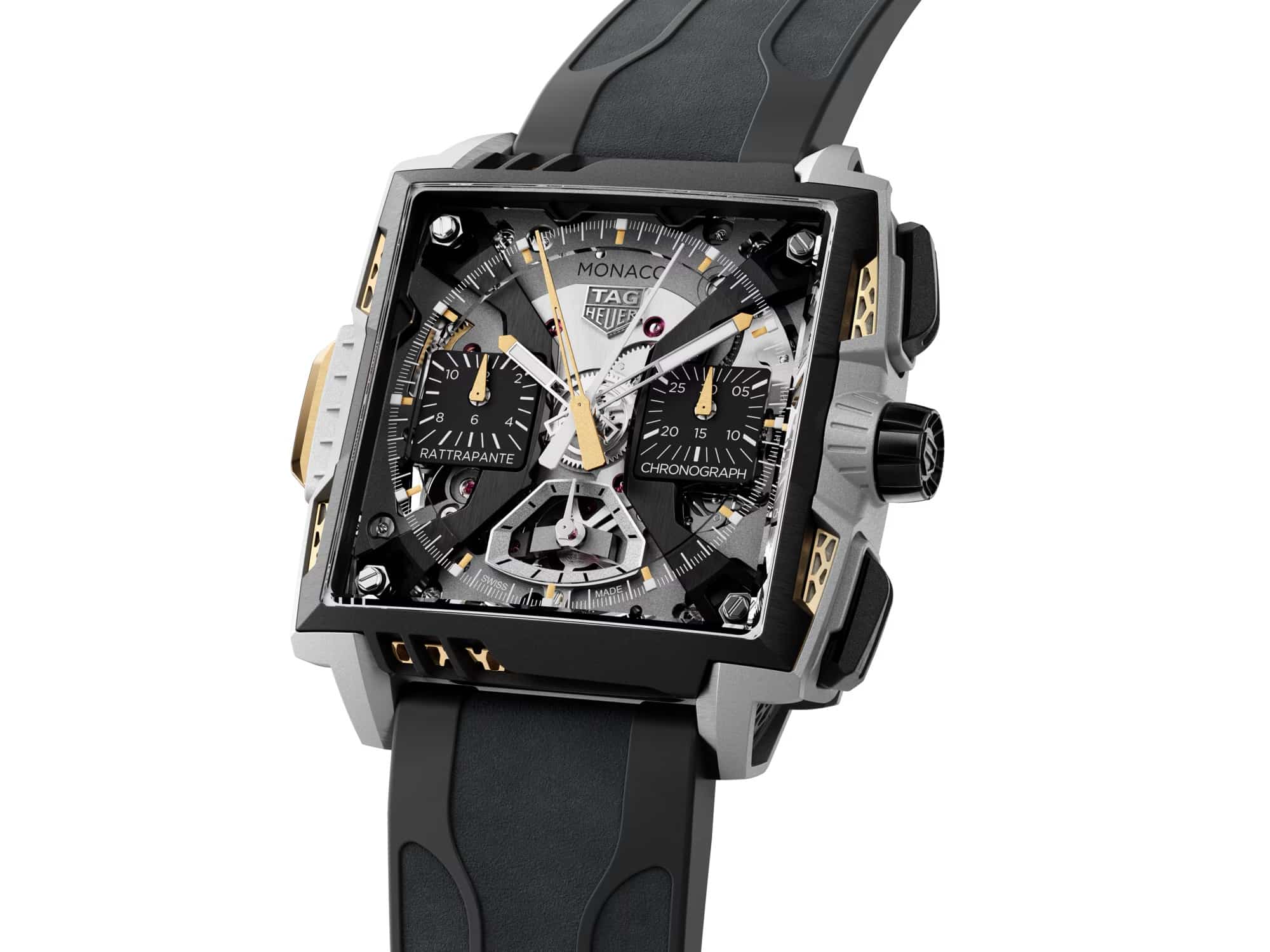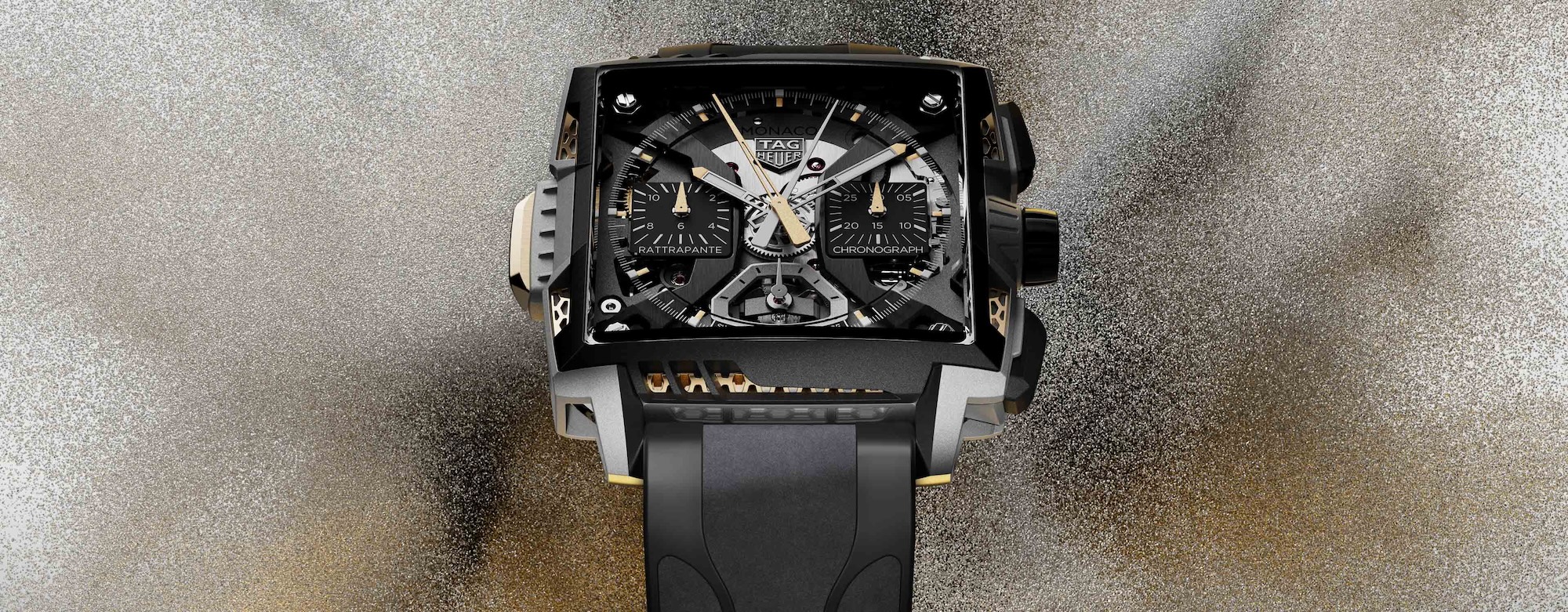 La legibilidad —algo que siempre genera dudas en diseños tan abiertos— es notable. Tanto la aguja central del cronógrafo, lacada en blanco, como la aguja central de la rattrapante, lacada en dorado, se distinguen rápidamente. La geometría del Monaco, con su caja cuadrada, aquí juega a favor: permite disponer los elementos de forma aireada, sin saturación visual.