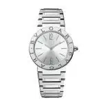 Impulsadas por movimientos de cuarzo con indicaciones de horas y minutos, las dos versiones Bulgari Bulgari para damas brillan en cajas de acero de 33 mm de diámetro en perfecta sintonía con sendos brazaletes de acero pulido satinado.