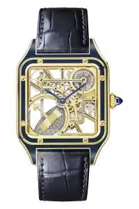 Obviamente, la novedad aquí es la vista sin obstáculos del nuevo calibre esqueleto automático 9629 MC de Cartier. Este movimiento consta de 212 componentes y ha requerido de casi dos años de desarrollo. Está suspendido entre una red de puentes de elegantes formas que se hacen eco de la forma cuadrada de la caja.