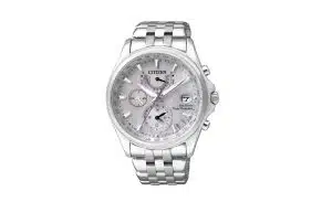 Ofreciendo las funciones de horas, minutos y fecha, ubicada en una pequeña ventana rectangular con un cristal de aumento ovalado, a las 3 en punto, también incluye el día de la semana, que Citizen remarca como calendario. en una abertura en la parte superior en la que también se sitúa la visualización de reserva de carga. Continuando con las funciones tenemos el cronógrafo, con segundero central y operándose desde los pulsadores del lado derecho de la caja, de fácil manipulación y que flanquean la corona, que permite realizar los ajustes y va protegida por dos guardas adaptadas al diseño redondo de la caja. Aun con la calificación de 100 m para la hermeticidad, la corona se saca tirando, no es roscada. A las 9 horas, un práctico indicador am-pm de 24 horas se muestra en una pequeña subesfera. La alarma diaria, junto con la hora mundial, indicada en el perímetro biselado de la esfera por cada ciudad, completan la funcionalidad. Las manecillas y los índices llevan material luminiscente para mejorar la legibilidad.