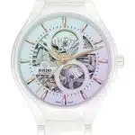 Dos de los modelos están disponibles en cerámica blanca o negra pulida, y un tercer modelo está hecho de cerámica de plasma, un material aún más complejo que se obtiene cociéndolo a 20.000 ºC para lograr un acabado similar al metal líquido. La edición limitada a 888 relojes se distingue por su caja y brazalete de cerámica blanca pulida y un cristal de zafiro dicroico sobre la esfera, que cambia de color con diferentes ángulos de luz y visión.