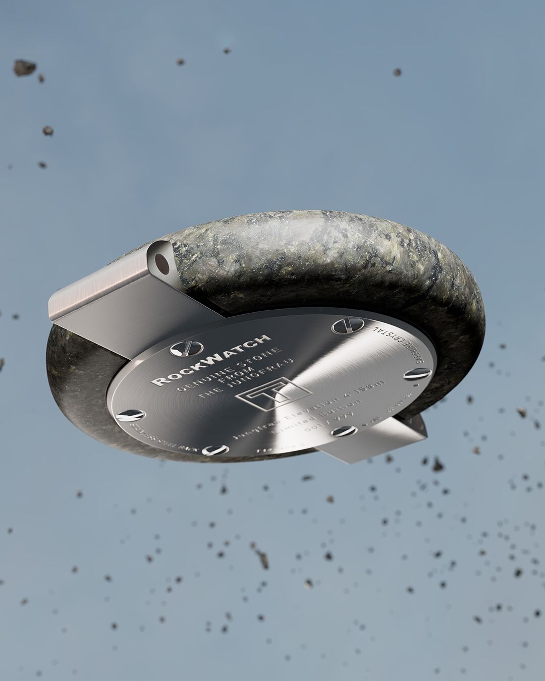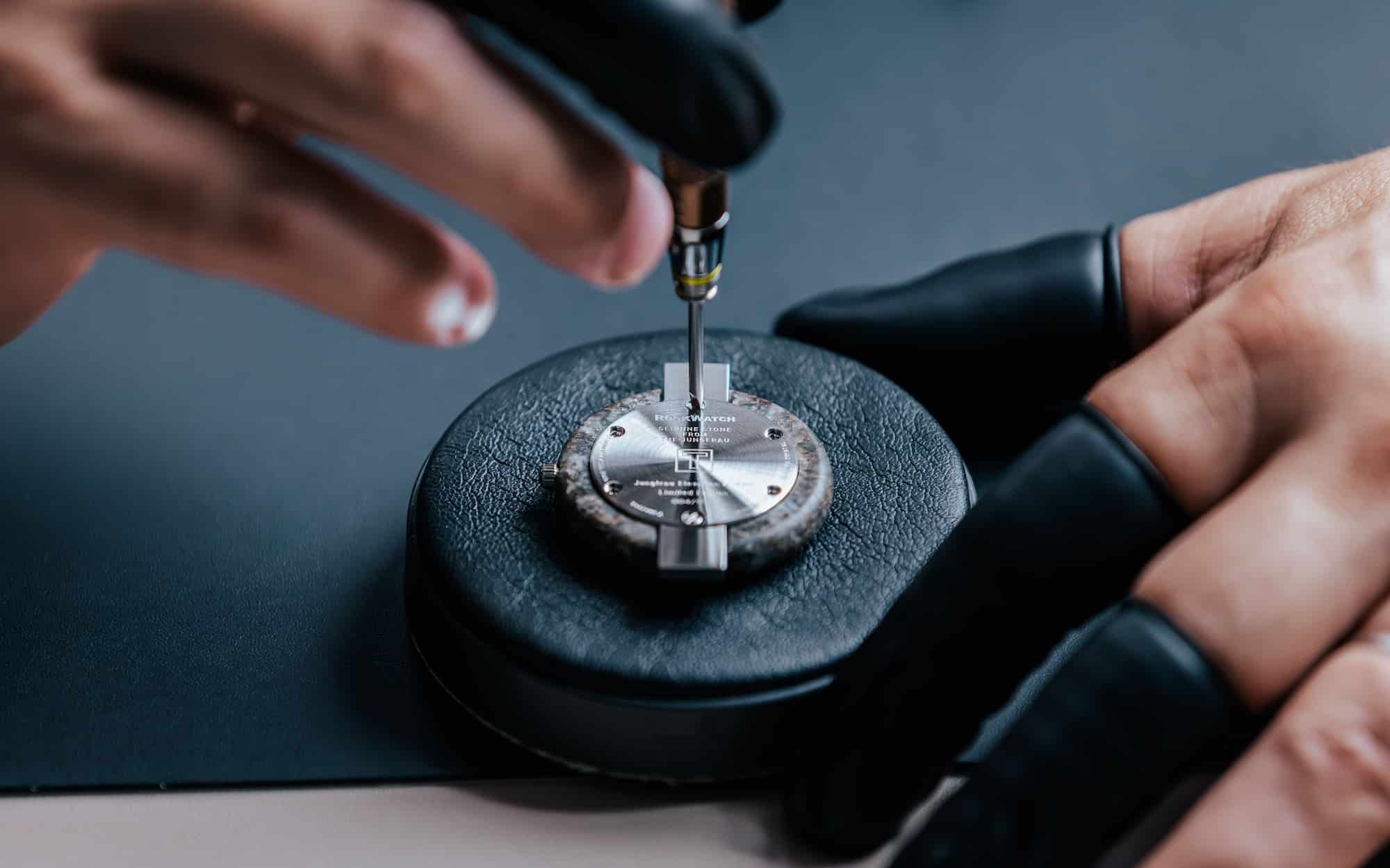 Cada reloj nace del granito auténtico del Jungfrau, la célebre montaña suiza que domina el horizonte alpino. De sus entrañas se extraen los bloques de piedra que, tras un proceso casi escultórico, se transforman en cajas de 38 milímetros. Cada una es distinta, con vetas, tonos y texturas imposibles de reproducir, lo que convierte a cada RockWatch en una pieza única, irrepetible y profundamente personal.