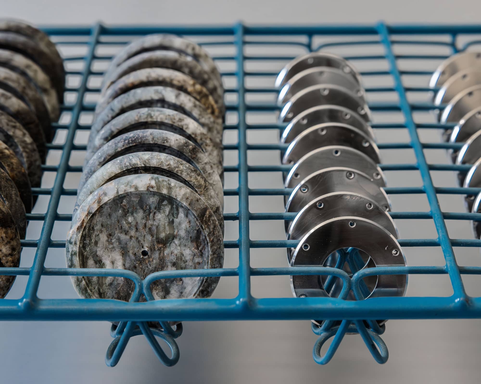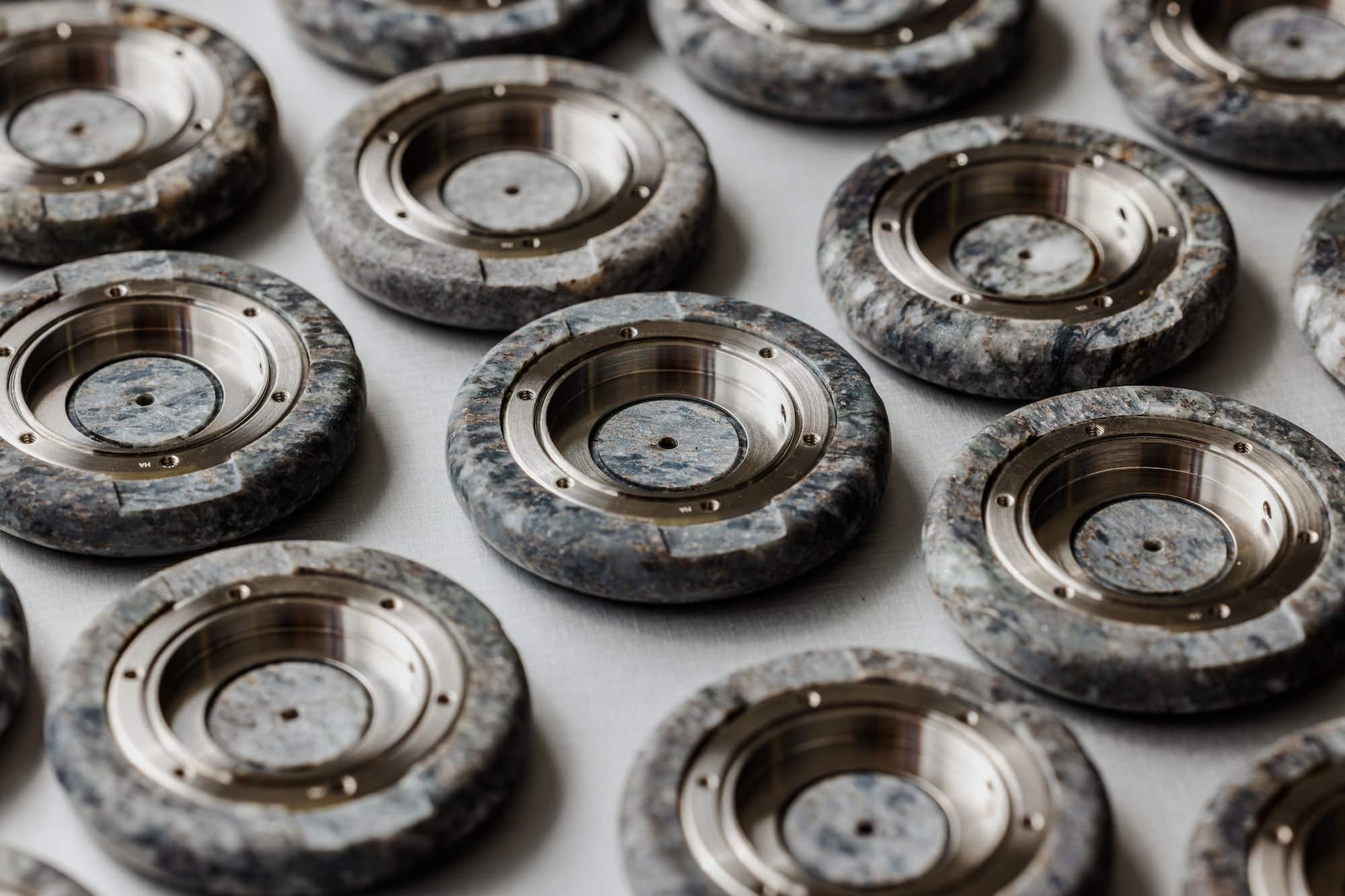 El proceso es fascinante y casi hipnótico. Los bloques de granito se cortan en cilindros que, a su vez, se dividen y estabilizan para evitar tensiones internas. Después, los artesanos —los mismos talleres que trabajaron el modelo original en los años ochenta— realizan un vaciado submilimétrico para alojar el movimiento.
